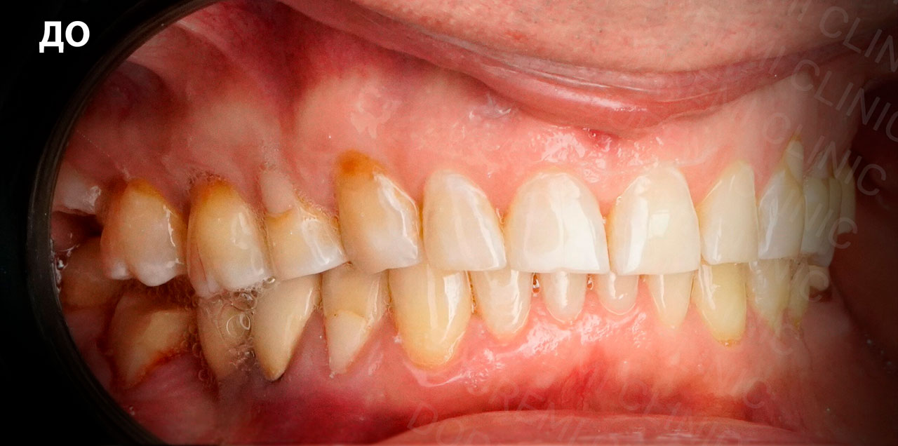 Пациент пришел с сильной стираемостью зубов из-за неправильного смыкания (аномалия прикуса II скелетный класс), а вместе с этим с потерей высоты прикуса.