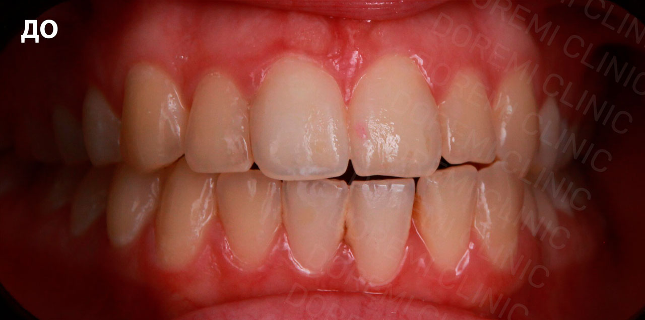 Пациентке после ортодонтического лечения в другой клинике было сложно сомкнуть губы, из-за сильно завышенного прикуса.