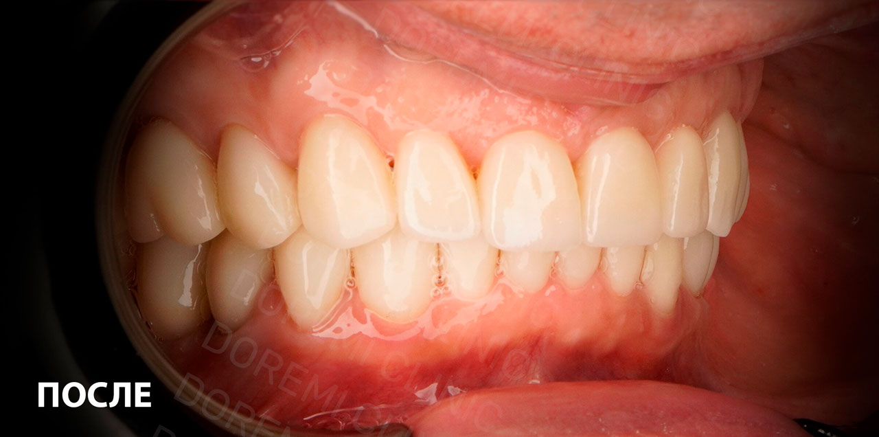 Установили стандартную брекет-систему в тандеме с 2 мини-винтами, которые ускорили процесс выравнивания. Время лечения - 1,5 года