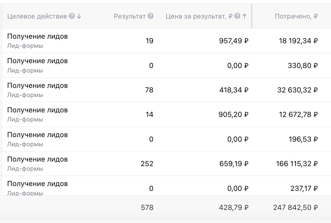 В рамках работы были протестированы различные сегменты аудиторий, собранные как с помощью внутренних инструментов рекламного кабинета VK ads, так и с помощью различных парсеров. Лучшей оказалась связка аудитории, полученная с помощью пересечения интересов и ключевых слов. Также дополнительно обязательно фильтровали аудиторию по полу и возрасту. Интересный нюанс: изначально мы получали большое количество заявок от лиц из стран ближнего зарубежья. Для того, чтобы получать больше заявок именно от коренных жителей столицы мы регулярно применяли различные фильтры