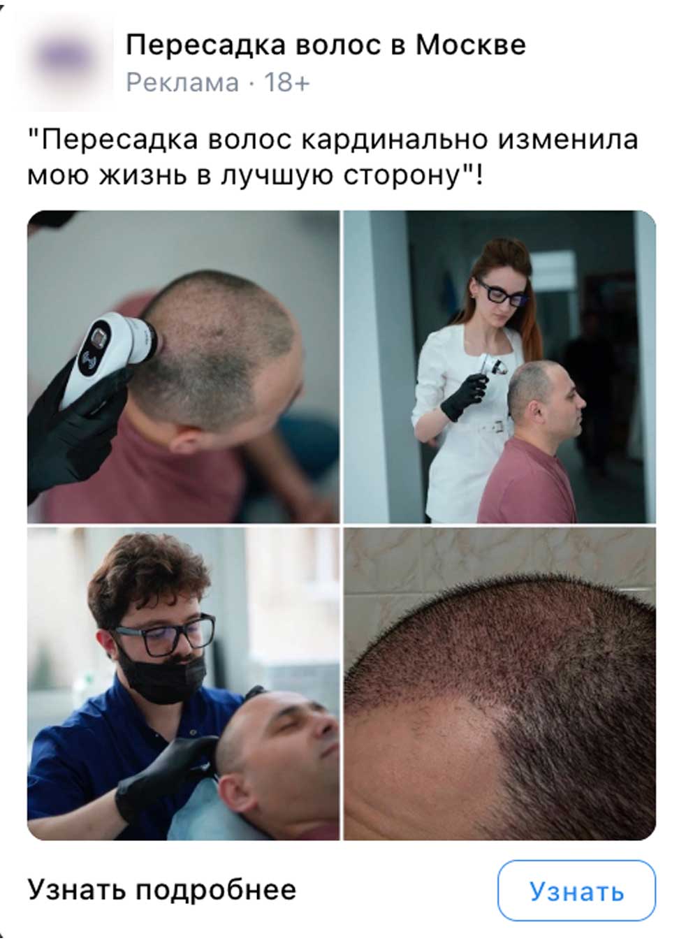 Клиника пересадки волос обратилась к нам с задачей по привлечению мужчин из Москвы на услугу по пересадке волос. Стоимость данной услуги от 135.000 до 500.000 рублей в зависимости от типа осуществляемой процедуры. Мы проанализировали рынок, составили нужные сегменты аудитории и приступили к тестированию гипотез, предварительно согласовав их с заказчиком. Пациентов привлекали с помощью лид-форм в VK ads