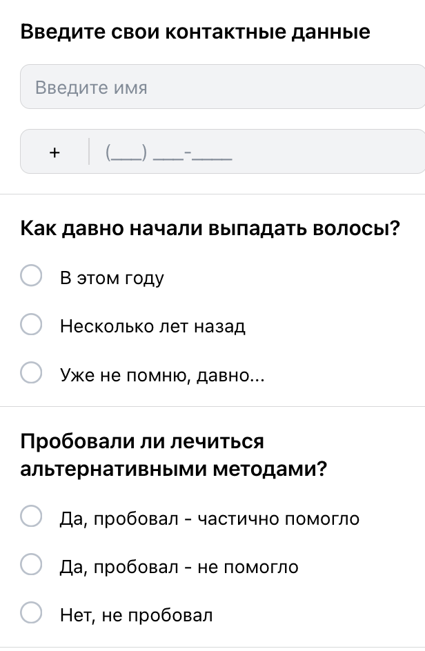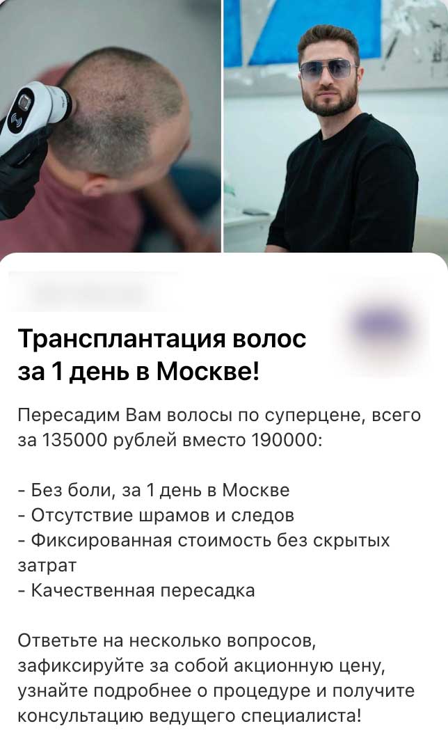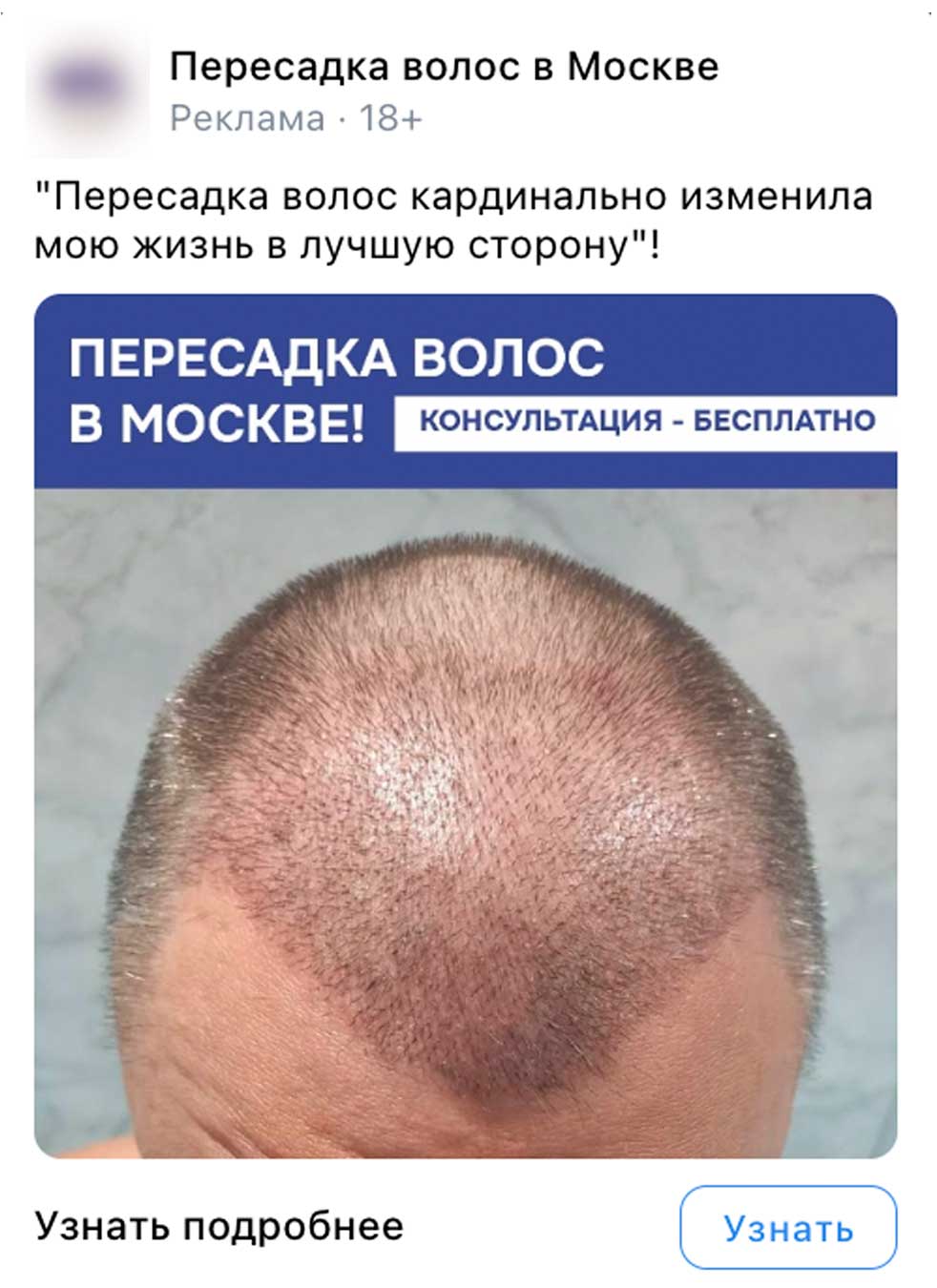 Задача: Получать заявки от потенциальных пациентов на услугу пересадки волос дешевле 1000 рублей.