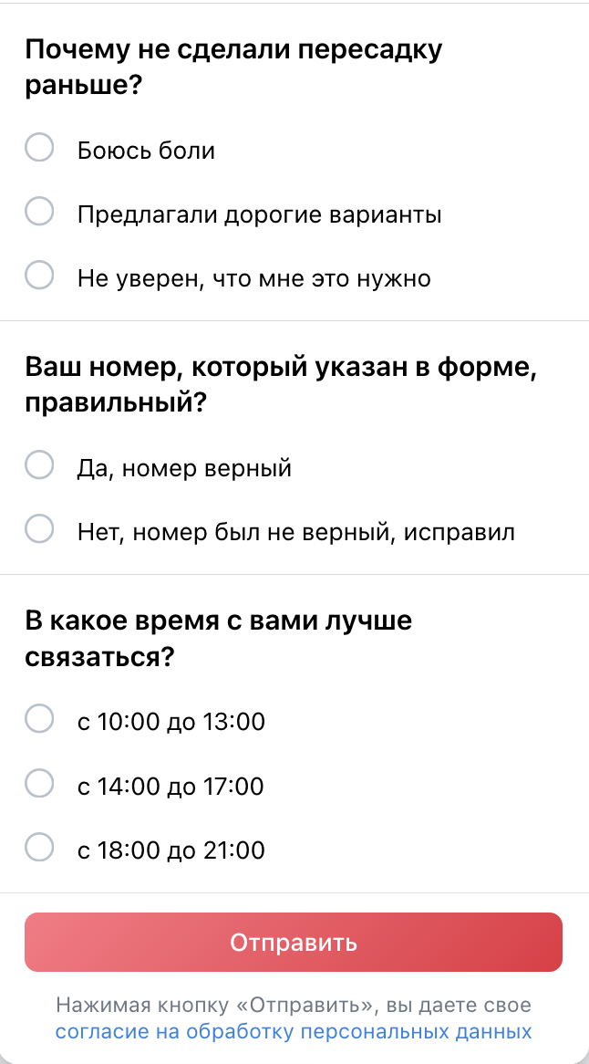 Для получения заявок мы выбрали в виде посадочной страницы лид-формы VK, в которые добавили необходимые нам вопросы, а также подробную информацию о стоимости и деталях процедуры. После того, как человек отвечает на вопросы и отправляет заявку - она сразу же отправляется в ТГ-канал с заявками, где менеджер клиники уже связывается с пациентом либо сразу, либо в выбранное время. Учет всех заявок ведется как в CRM-системе, так и в таблице учета заявок.